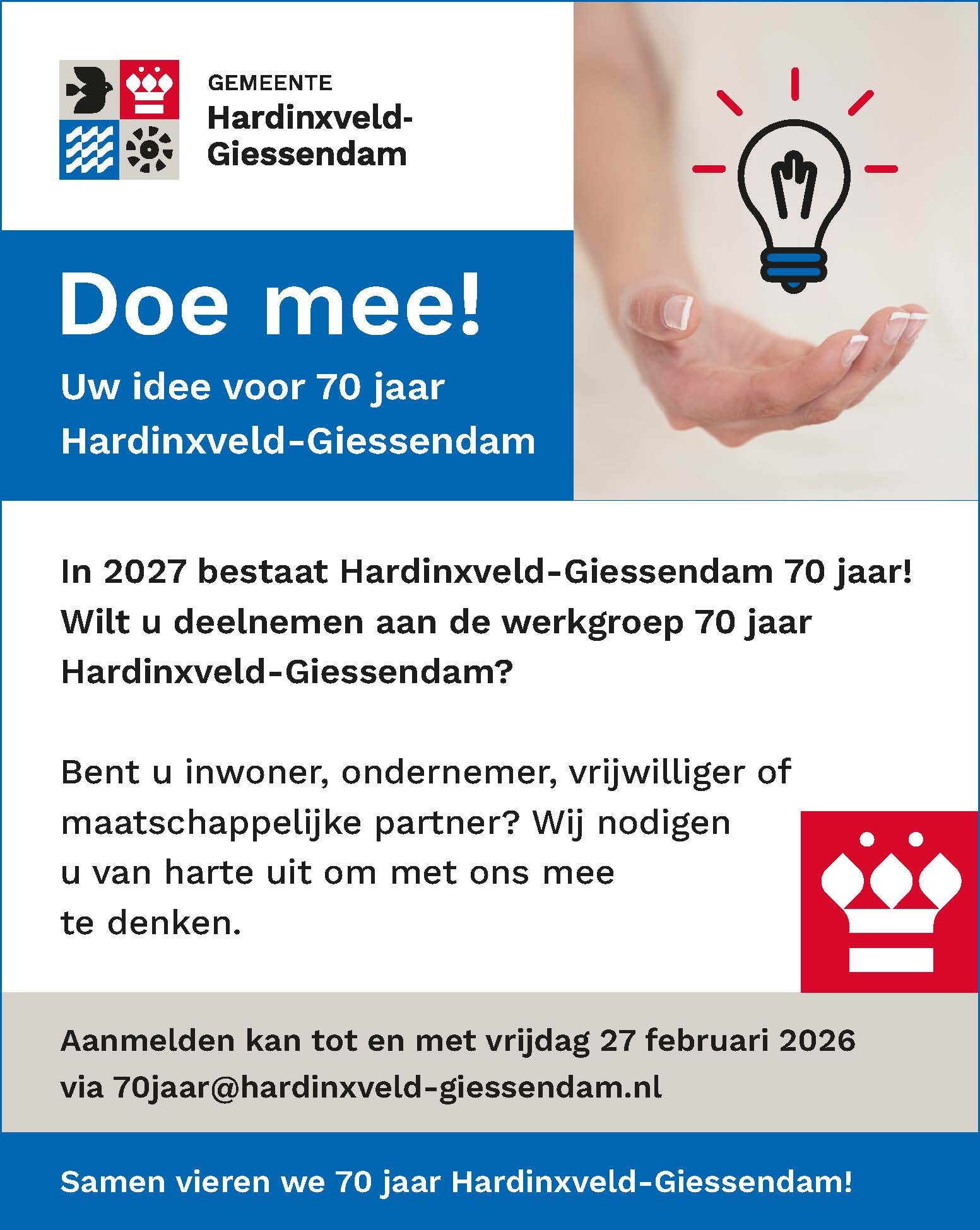 Aanmelden kan tot en met zaterdag 28 februari 2026 via 70jaar@hardinxveld-giessendam.nl